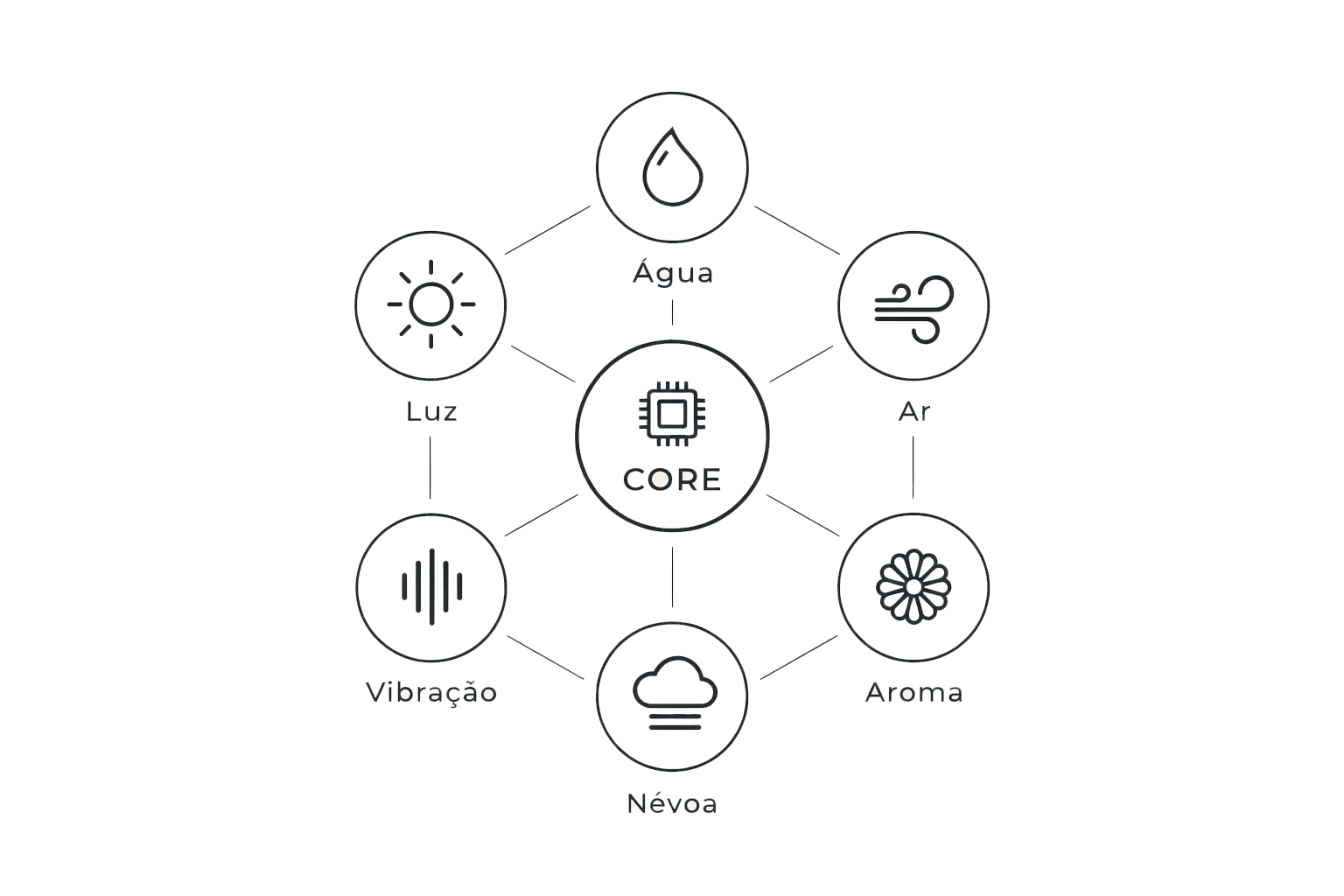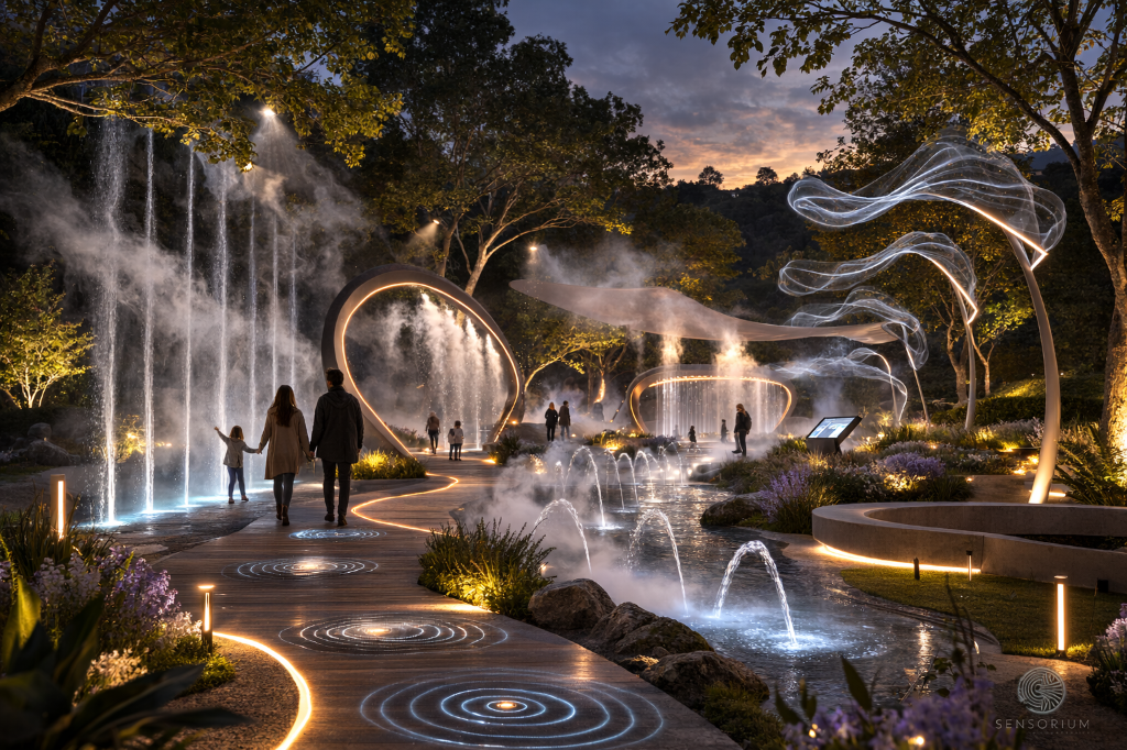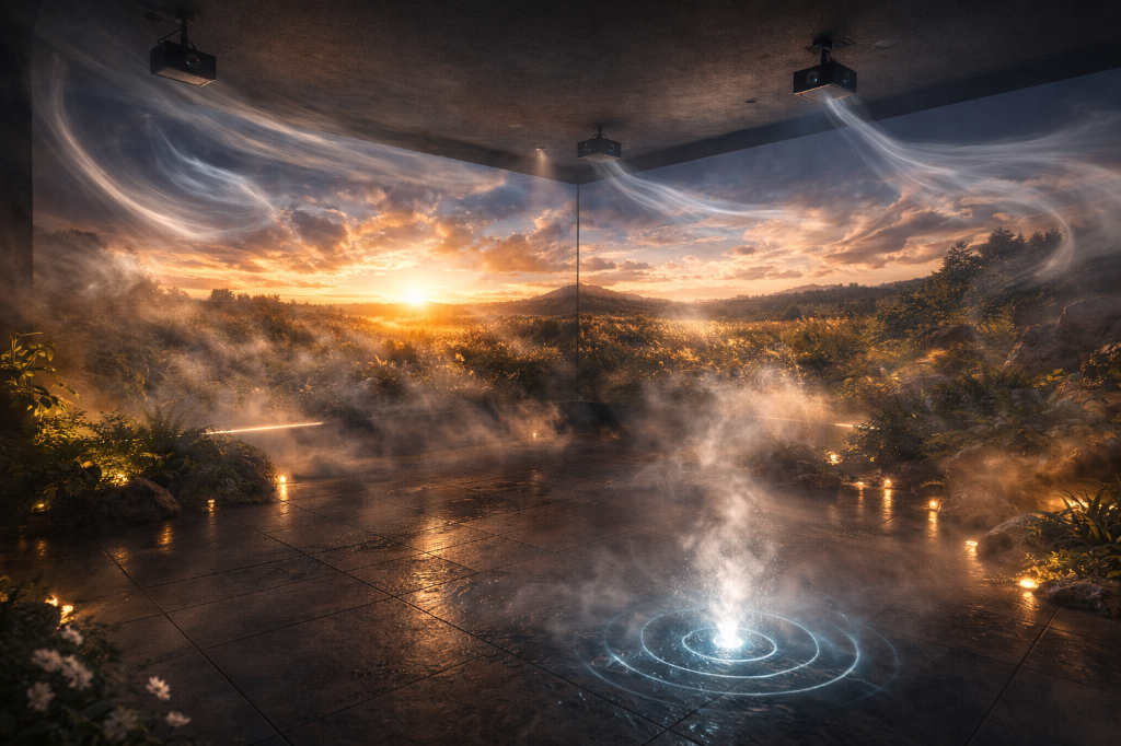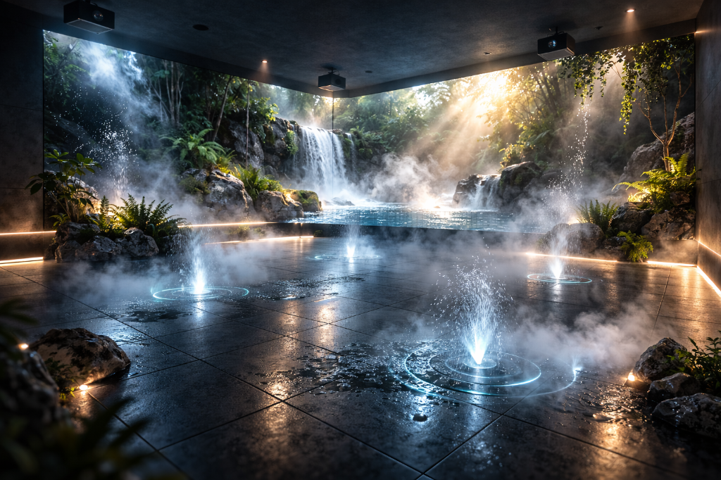Luz, vibração, água, névoa, ar e aroma integrados numa arquitetura coerente.