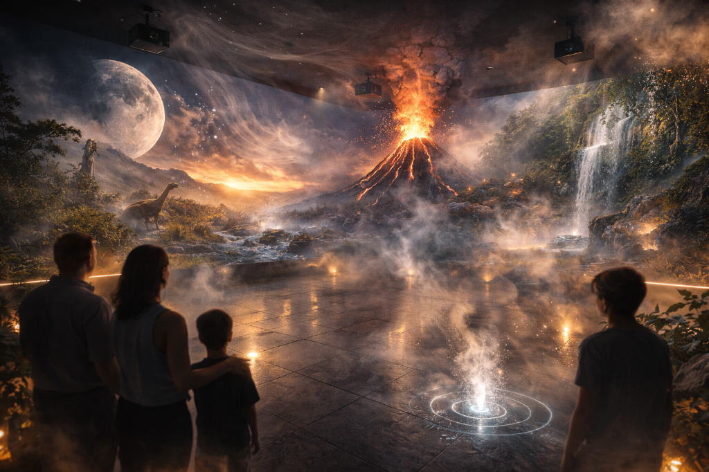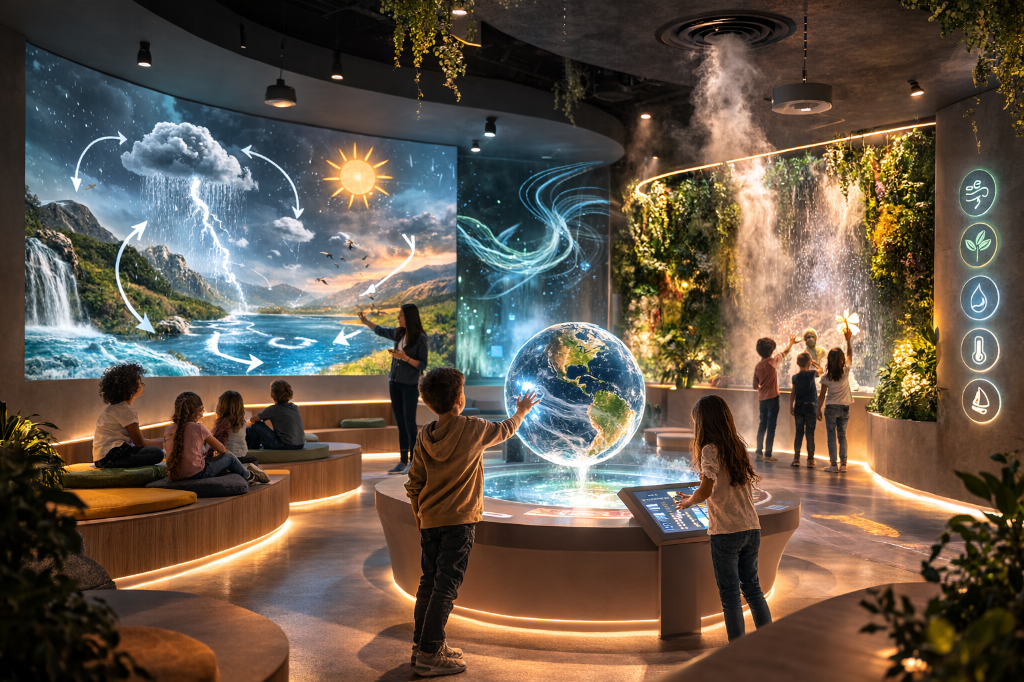Salas imersivas, percursos sensoriais e ambientes atmosféricos que ampliam a compreensão de fenómenos naturais e científicos.
