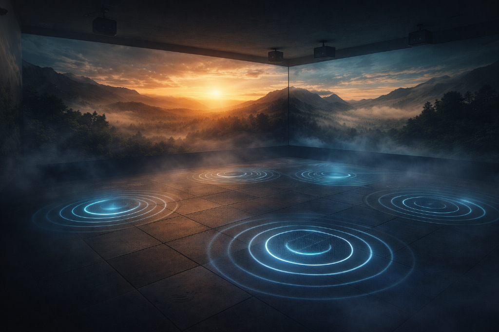 Cada projeto é concebido como uma arquitetura única, onde imagem, som e estímulos físicos são sincronizados por um núcleo central de controlo e segurança.